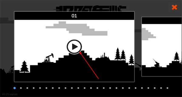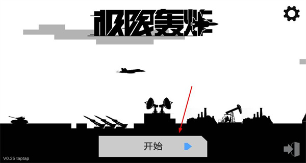 1、進入極限轟炸游戲后,畫面呈現黑白軍事場景,中間有開始按鈕,點擊該按鈕,進入關卡選擇頁面。