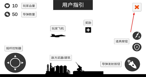 3、在用戶指引界面,有玩家飛機、敵方建筑等元素說明,右上角有關閉按鈕,點擊關閉,進入游戲操作界面。