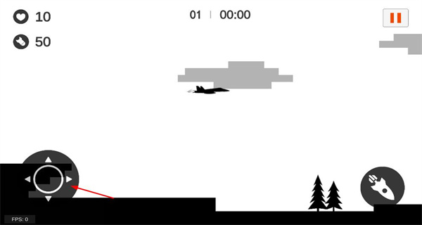 4、進入游戲操作界面,左下角有搖桿控制器,通過搖桿控制飛機移動,準備發射導彈攻擊敵方目標,開始游戲挑戰。