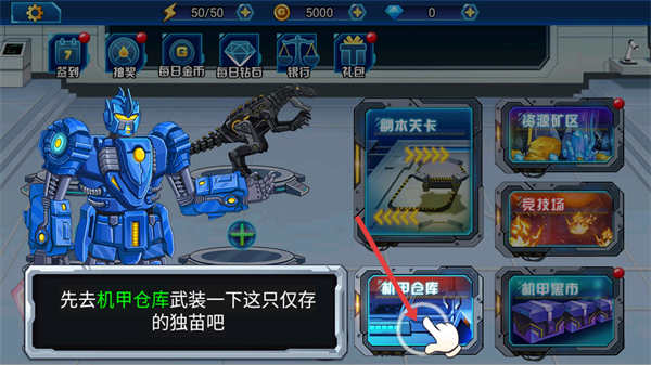 1、在主界面點擊機甲倉庫,進入機甲武裝界面,這是為機甲配置部件、提升戰力的核心入口。
