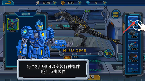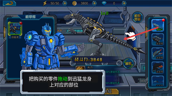4、將已購買的零件拖動到迅猛龍機甲對應的部位,完成部件安裝,以此增強機甲的戰斗力。