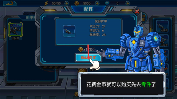 3、在配件界面選擇腹部護甲,花費1200金幣點擊確認購買,即可獲得該部件,用于提升機甲的攻擊、防御等屬性。