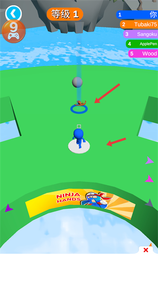2、在等級1的場景中靠近武器區域獲取弓箭,提升攻擊能力關注右上角的排名,操控角色移動。
