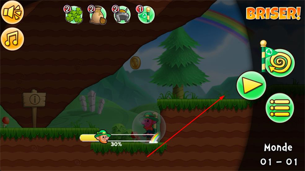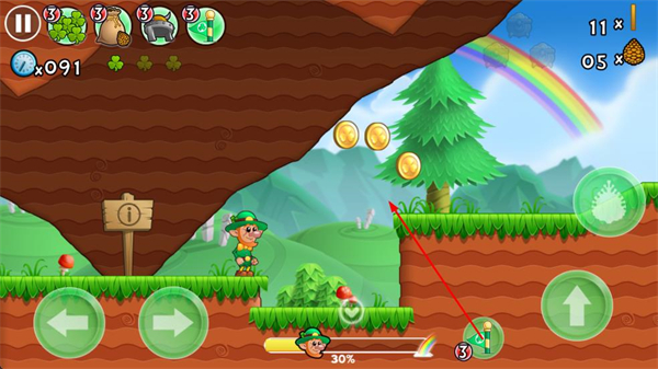 3、操控精靈在場景中移動利用二段跳跨越溝壑,收集空中的金幣,同時注意場景中的地形變化,推進冒險進程。