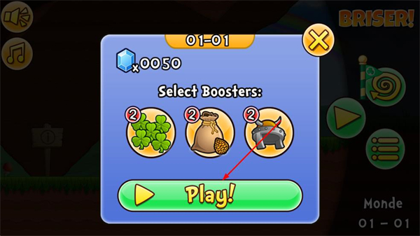 1、進入第一個關卡準備界面,查看擁有的50鉆石,選擇對應的boosters道具,確認后點擊Play按鈕,進入關卡開始冒險。