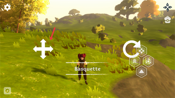 2、利用虛擬十字鍵操控角色移動在草原場景中探索熟悉操作方式,關注界面上的功能按鈕為后續的跳躍、戰斗等。