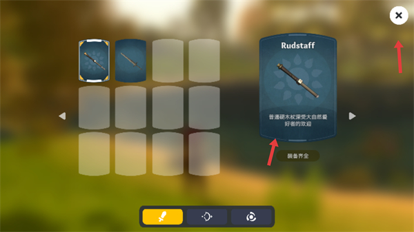 4、查看裝備界面了解手中的硬木杖等武器道具點擊關閉按鈕返回游戲場景,根據裝備的屬性規劃戰斗和探索策略。
