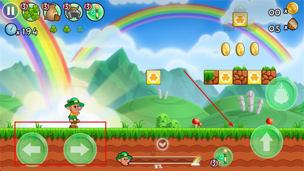 1、關卡場景中操控精靈通過左右按鈕移動,觀察上方的彩虹與金幣分布,準備利用跳躍操作收集場景中的道具,推進冒險進度。