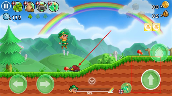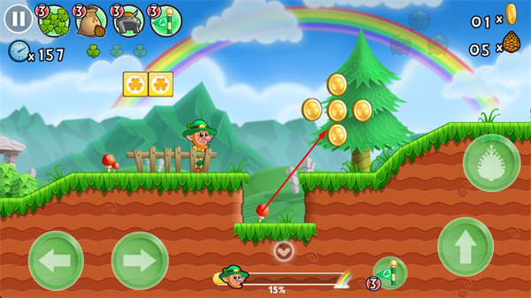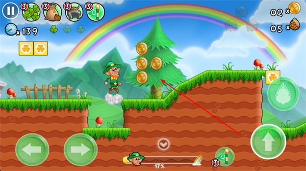 2、點擊向上按鈕讓精靈跳躍避開場景中的障礙,同時收集沿途的四葉草道具,提升當前關卡的資源獲取量,繼續向目標區域前進。