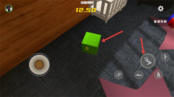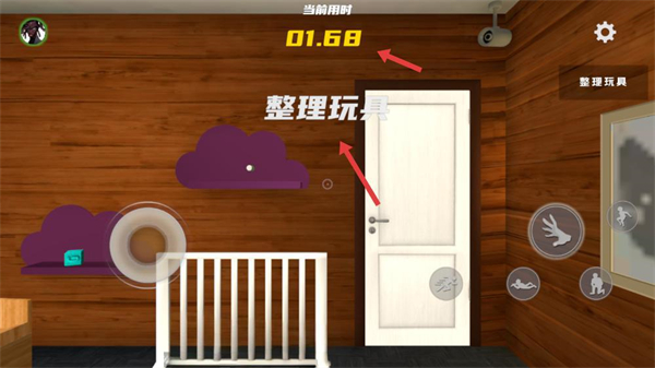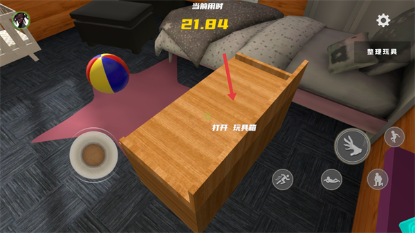 2、在整理玩具任務中關注當前用時,盡快完成整理,利用虛擬按鍵操控角色移動在房間內尋找散落的玩具。