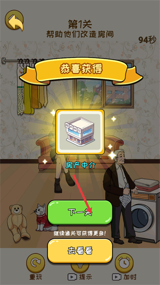 4、關卡完成后點擊下一關,可解鎖新關卡并獲得獎勵如房產中介道具,推進游戲進度。