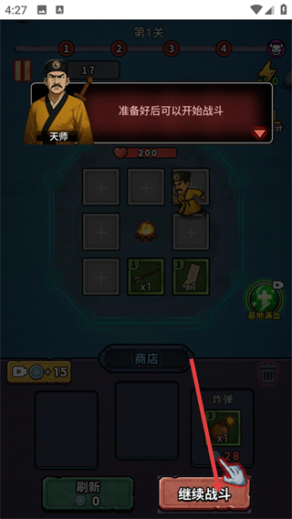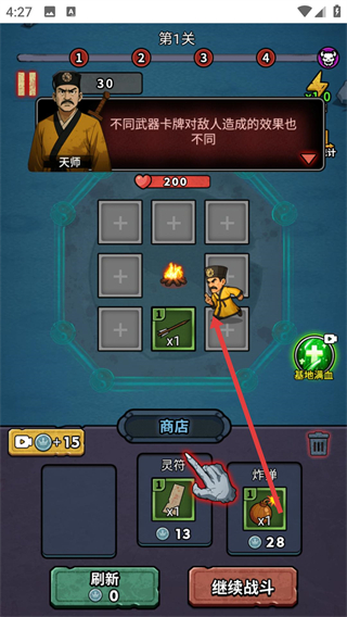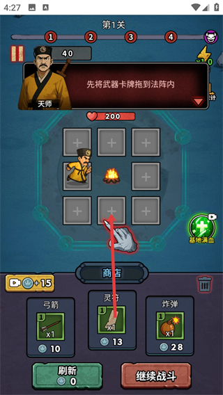 1、在關卡準備界面,將商店中的武器卡牌如弓箭拖動到法陣格子內,這是配置戰斗道具的核心步驟,為后續戰斗提供攻擊手段。