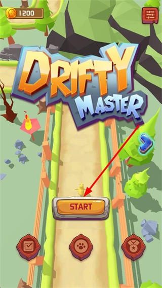 1、進入游戲點擊START按鈕開始挑戰,界面顯示金幣數量,可用于解鎖角色或升級道具,開啟漂移冒險之旅。