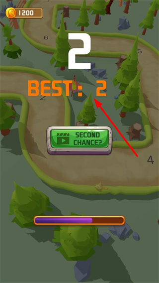 3、挑戰結束后顯示關卡成績和最佳記錄,可選擇觀看廣告獲得第二次機會,提升挑戰成績,刷新最佳記錄。