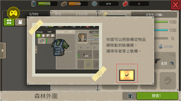1、游戲開局有裝備欄操作提示,可將裝備從物品欄移到裝備欄,保存并穿上裝備,為末日生存筑牢裝備基礎。