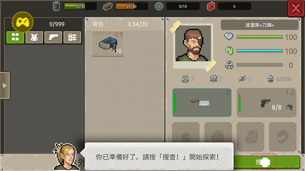 2、在背包界面可查看角色及武器裝備,準備妥當后按搜查按鈕,正式開啟末日生存的探索征程。
