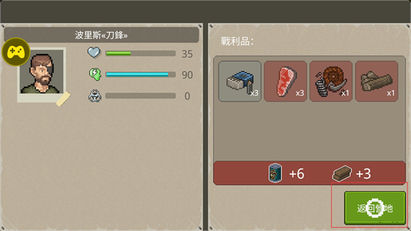 4、探索結束后會獲得戰利品,如食物、材料等,查看后點擊返回營地,整理物資以備戰下一次末日探索。