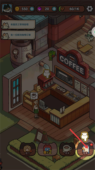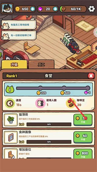 4、在升級界面點擊升級鈕,消耗資源如20咖啡豆提升設施,滿足任務要求的同時增強店鋪經營能力。