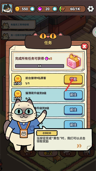 1、點擊界面底部的功能按鈕,觸發前臺接待顧客的流程,完成對應經營操作以推進任務進度。