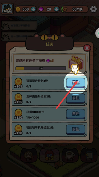 3、選擇任務列表中的目標任務如貓薄荷升級到2級,點擊前往按鈕進入對應功能界面,推進任務完成條件。
