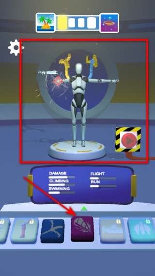 1、為機械角色裝配不同功能部件,如攻擊、攀爬等類型,自定義其能力,還能解鎖新部件來強化角色,為跑酷競技做準備。