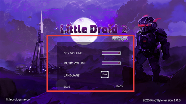 1、首先進入設置界面,可調整音效音量、音樂音量,選擇適合自己的語言,設置完成后點擊保存,為開始游戲做好準備。
