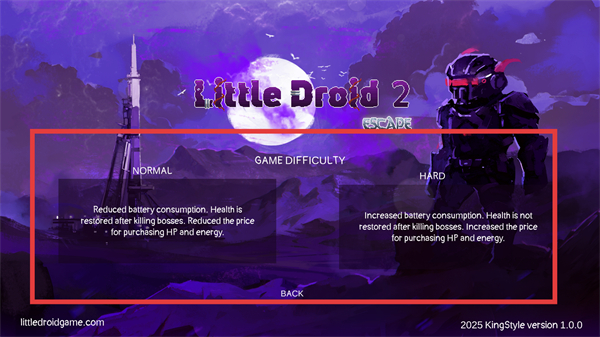3、進入后要先選擇游戲難度,可根據自身水平選擇NORMAL或HARD難度,NORMAL難度有電池消耗減少、擊殺boss后恢復生命值等福利,HARD難度則相反。
