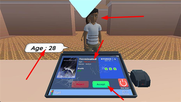 1、需在售票機后等待顧客,跟隨提示開展影院經營相關工作,開啟影院服務流程。