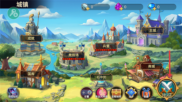 2、在城鎮界面可看到主城、兵營、商城等建筑,還有成就、國庫等功能區點擊出征可進入戰斗。