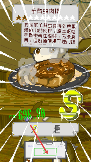 4、通關后可獲得菜品如手臂蟲肉排,這類菜品是游戲的核心產出物,部分食材如嘔嘔手臂蟲原本具有毒性,需通過烹飪處理后才可食用。