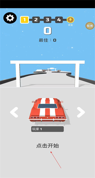 1、打開游戲后,進入起始界面,紅色賽車停靠在起點,界面提示點擊開始,點擊該提示,進入配備方向盤操控的賽道場景頁面。