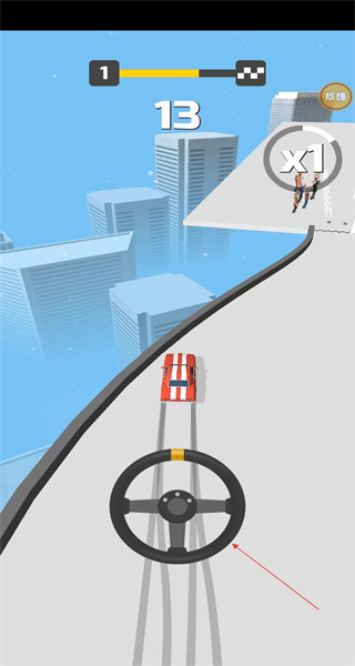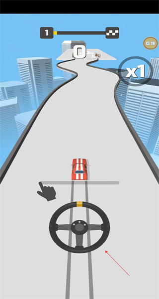 2、在賽道場景頁面,城市背景下的蜿蜒賽道呈現,按照提示操控方向盤,驅動賽車在賽道行駛,開始積攢分數,慢慢掌握操控韻律。