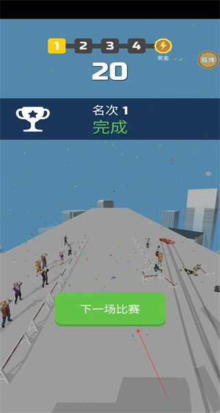 4、賽事結束后,界面展示名次1完成的成就,還有下一場比賽的綠色按鈕,點擊此按鈕,進入下一場賽車賽事的準備界面。