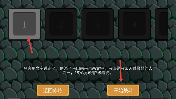 2、選擇關卡1后點擊開始戰斗即可進入與馬山的對戰,若想提升實力可選擇返回修煉為戰斗做好準備。
