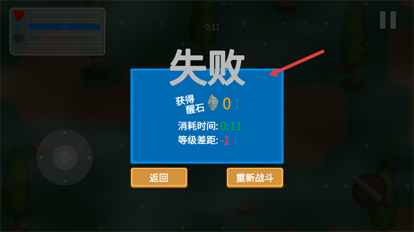 4、若戰斗失敗可選擇重新挑戰或點擊返回調整策略,戰斗失敗會獲得0醒石,需盡量避免等級差距過大導致失敗。