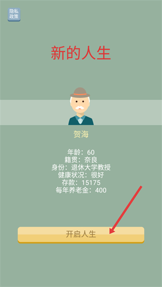 1、在新的人生界面了解角色賀海的年齡、籍貫、身份等信息后,點擊開啟人生即可開始老年模擬生涯,開啟屬于你的大爺人生。