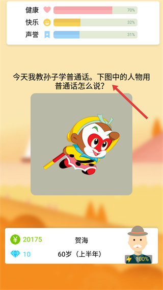 3、在教孫子學普通話的場景中需正確回答人物的普通話說法,完成任務可獲得資源,同時關注健康、快樂、聲譽屬性的變化。