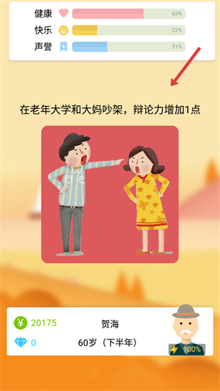 4、在老年大學和大媽吵架的事件中該行為會增加1點辯論力,但可能影響健康、快樂屬性,需權衡利弊,根據自身發展需求選擇行為。