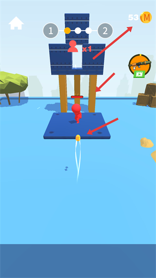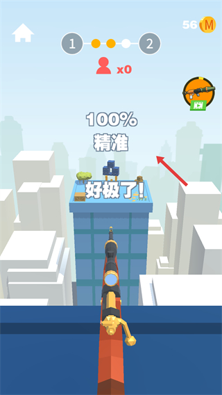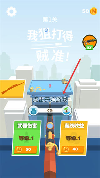3、面對有建筑遮擋的目標要精準瞄準,擊中目標后可獲得金幣,積累金幣用于提升游戲屬性,助力后續關卡挑戰。