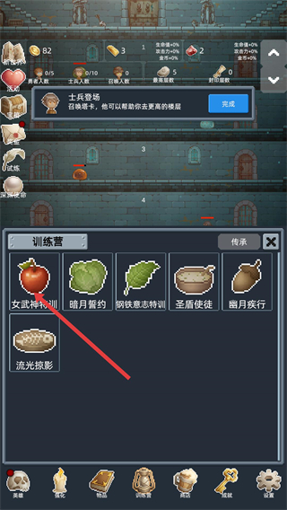 1、點擊底部訓練營按鈕,進入訓練界面,該系統可通過消耗資源解鎖訓練項目,提升英雄屬性。