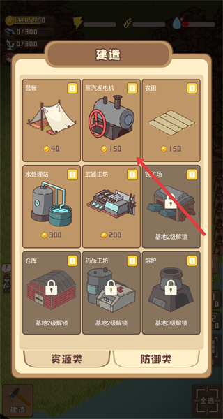 3、然后選擇要建造的建筑,如帳篷、發電機等,確保資源充足后進行建造操作。