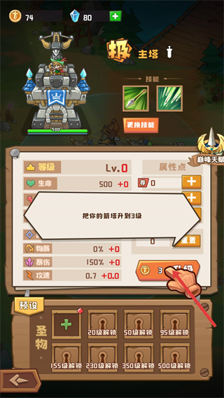 3、進入主塔界面,消耗資源金幣執行升級操作,將主塔提升至3級,升級后可增強主塔的基礎屬性。