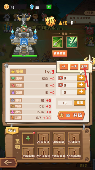 4、主塔升級至3級后,可解鎖一鍵全部升級功能,該功能可批量提升主塔屬性,簡化養成操作流程。