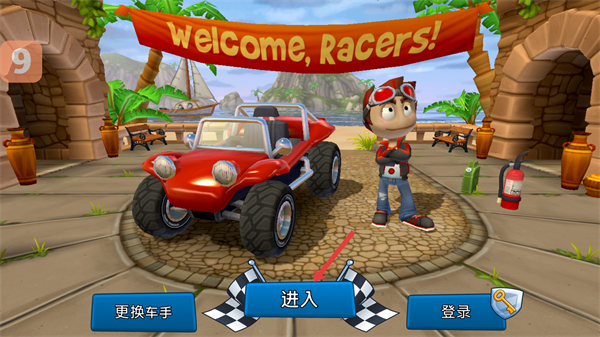 1、在游戲主界面點擊進入按鈕可開始賽車挑戰,選擇心儀的賽車和車手,開啟椰子島的賽車選拔賽之旅。