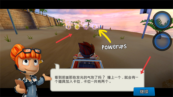 2、游戲中撞擊發光氣泡可獲得道具卡位有兩個,合理收集道具,在合適時機使用,助力賽車競技,提升比賽優勢。