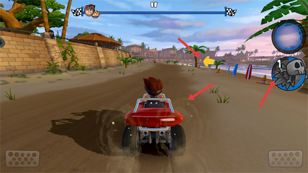 3、使用道具時注意賽道情況骷髏道具可干擾對手,同時關注賽道上的箭頭指示,選擇最優路線,保持賽車速度和穩定性。