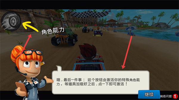 4、激活特殊角色能力需等道具加載好后點擊按鈕,利用角色能力提升賽車性能,在多人競速中脫穎而出,獲得比賽勝利。