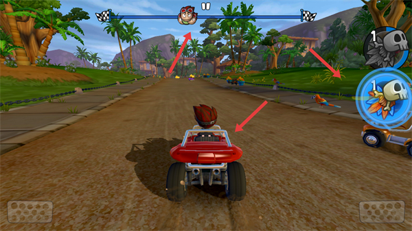 1、賽車時關注上方賽況條利用骷髏道具干擾對手,保持賽車在賽道中央,避免碰撞路邊植物和車輛,爭取領先位置。