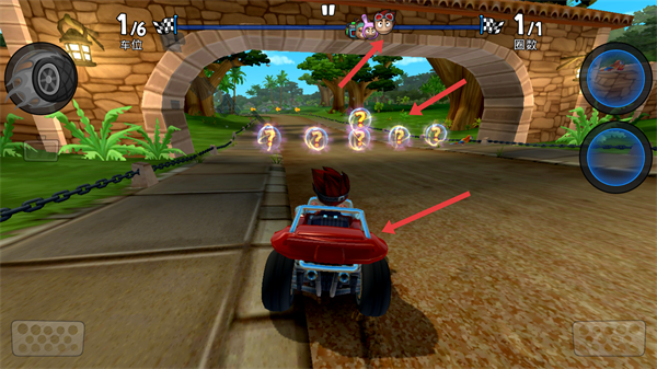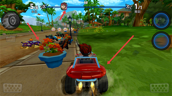 2、比賽中注意車位和圈數避開花盆等障礙物,利用加速道具提升速度,超越前方車輛,同時關注賽道上的道具氣泡,及時收集。
