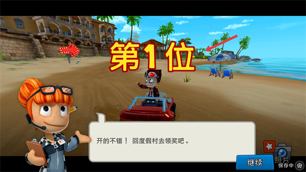 4、獲得第1位后點擊繼續按鈕,返回度假村領取獎勵,積累獎勵可用于車輛改裝或解鎖新角色,提升后續比賽的競技能力。